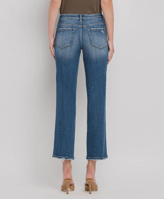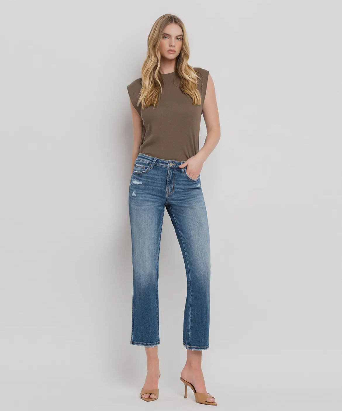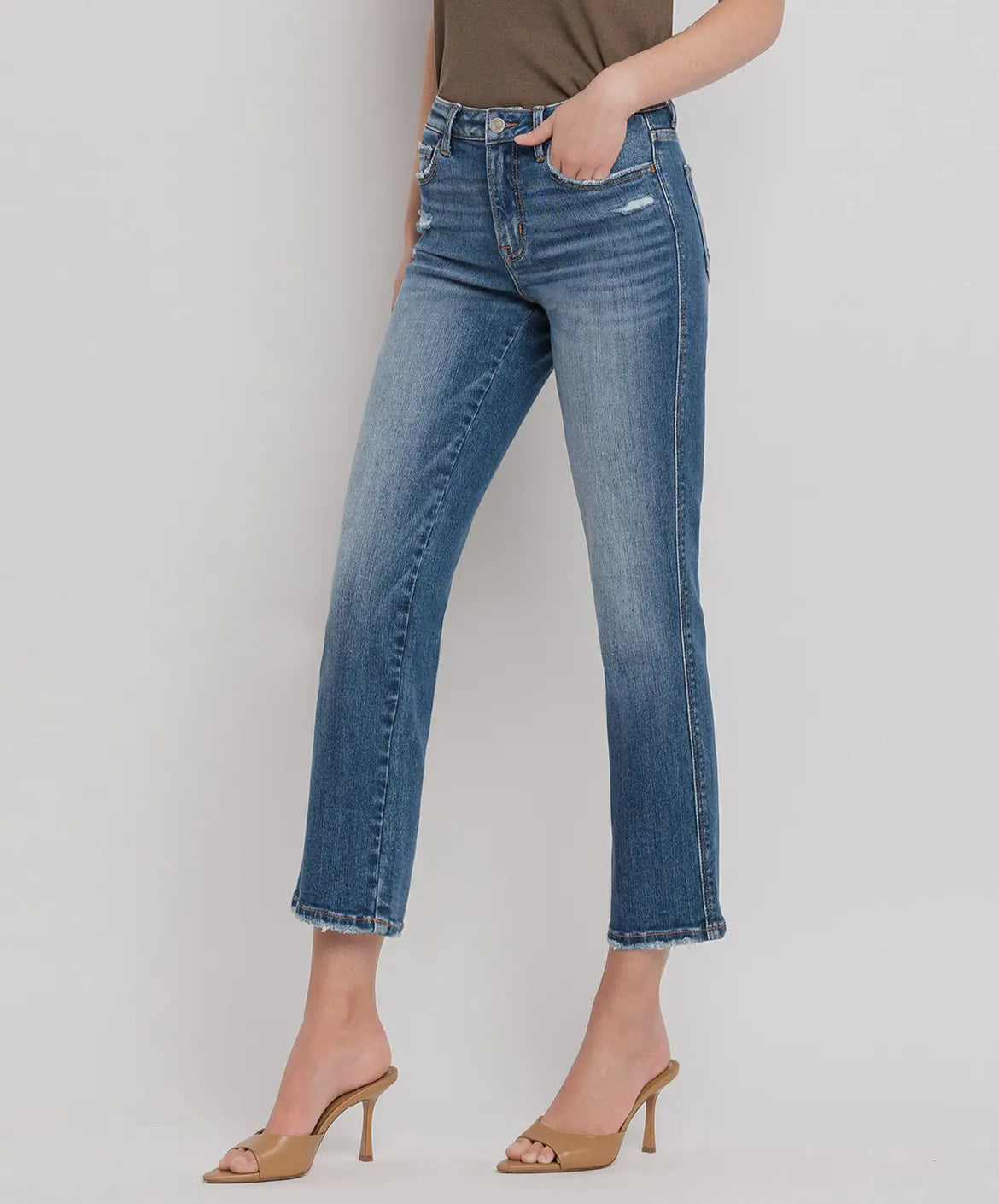 Lovervet comfort stretch high rise straight, 10” rise, 27” inseam.
